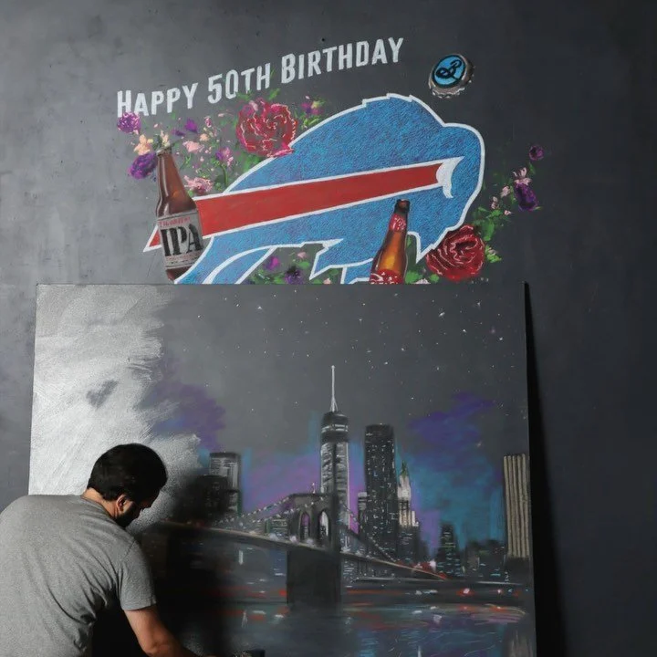 Grateful to work a dream job! It began over a decade ago, drawing a chalk sketch for my own wedding at Little Owl the Venue on Greenwich Ave. After that, Maggie Hollingsworth, florist, friend and head of decor, asked if I’d like to draw some chalk walls for clients at Little Owl and Blackfoot Hospitality. 12 years later, 2,000 + murals and commissions and still loving every experience. I am honored to help celebrate many weddings, showers, events and gatherings. Commercial work has included; GE, Kellogg’s, Public Art Fund for Jeff Koons, AMEX, Delta, Google, NBC, Twitter, Instagram, Facebook, Amazon, Nespresso, Aldi, Condé Nast, Belmond Hotels, James Nomad Hotel. I also love the opportunity to create live drawing performances; MET Museum, AMNH, Arcosanti with pianist Sonya Kumiko Lee, Joe’s Pub, Red Eye drawing for cabaret legend Ms. Zilbert, painting featured on The Tonight Show with Jimmy Fallon courtesy of the Foodie Magician.